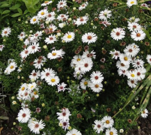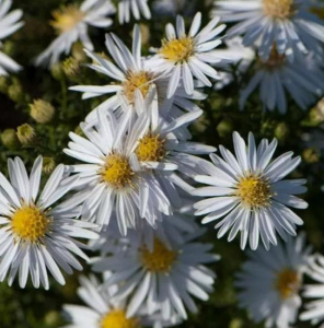 Цветки полумахровые, голубовато-синие с жёлтым центром. Цветение сентябрь-октябрь.