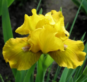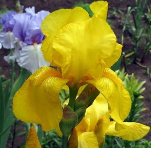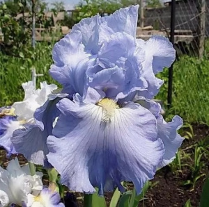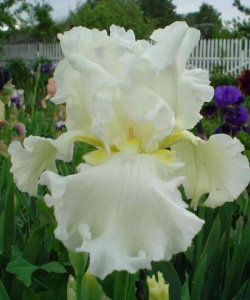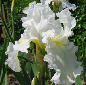 Цветки снежно-белые, с сильной гофрировкой лепестков и ярко-желтой, пушистой бородкой.