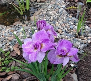 Цветок пурпурно-сиреневый с желто-зеленым горлом и белесыми полосками вдоль центра лепестков, края лепестков гофрированы, повторный, диаметр цветка 15 см.