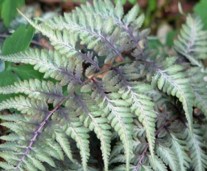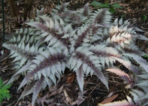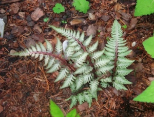 Высота растения 50 см, листья серебристо-зеленые с пурпурно-красными жилками и стеблем.