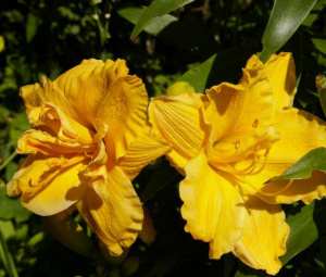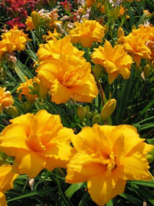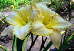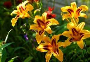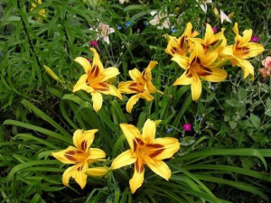 Цветок ярко-желтый с красным глазком и желтым горлом, цветение обильное, очень неприхотливый. Цветение июнь-июль.