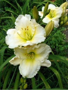 Высота растения 60см, цветок белый с зеленым горлом, желтый по краю, крупный, повторное цветение. Цветение июль-август.