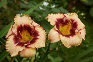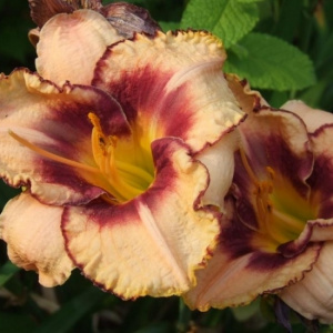 Высота растения 55см, цветок кремовый с пурпурным глазком и каймой, зеленое горло, повторное цветение. Цветение июль-август.