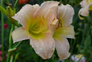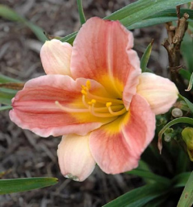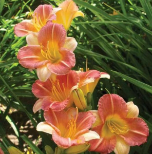 Высота растения 35см, цветок двухцветный: нижние лепестки кремово-желтые, верхние розовые, желтое горло, диаметр цветка 8см, очень длительное цветение, на 3-й год дает до 400 цветков за сезон.