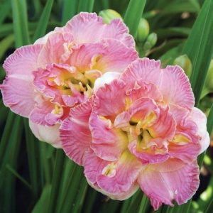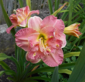 Высота растения 45см, цветок жемчужно-розовый с желтым глазком, махровый, повторное цветение.Цветение июль-август.