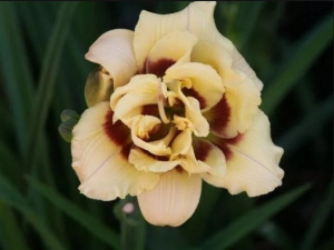 Высота растения 40см, цветок махровый, кремово-желтый с бордовым глазком и зеленым горлом, повторное цветение. Цветение июнь-июль.