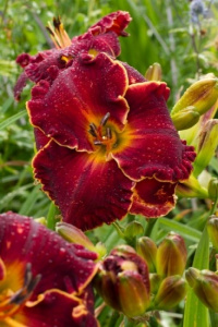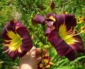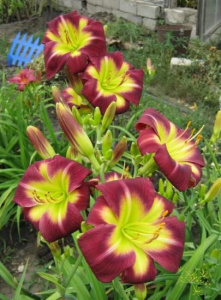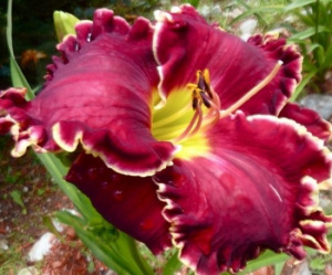 Цветок насыщенный темно-бордовый с зеленым горлом, повторное цветение. Цветение июнь-июль.