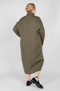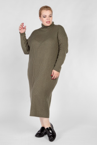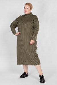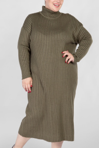 Платье свободного кроя из вязанного полотна. Плечо спущено, рукав длинный. На полочке в декоративных, косых разрезах обработаны карманы. В горловину втачан воротник-труба.