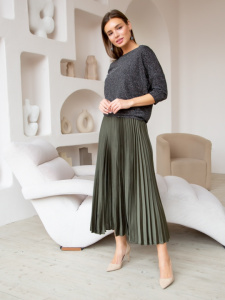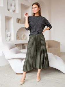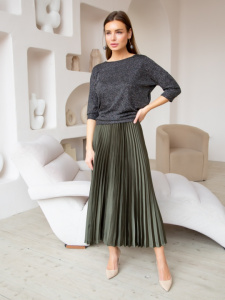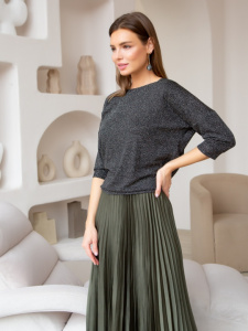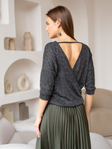 Джемпер из мягкого трикотажа с блеском, свободного силуэта, с запахом на спинке. Низ изделия на поясе. Низ рукава на манжете. Длина по спинке 51 см. 90% полиэстер, 10% эластан