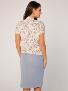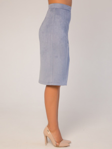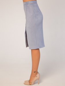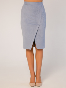 Юбка-карандаш стального цвета с имитацией карманов на полочке и декоративным швом с отстрочкой по центру. Выполнена из плотной и эластичной эко-замши, которая незначительно растягивается и за счет этого идеально садится по фигуре. На спинке застежка-молния и разрез. Верх юбки на поясе, посадка четко по талии. Длина по спинке 62 см. 90% полиэстер, 10% эластан