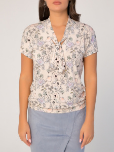 Блузка без рукава из эластичной ткани с цветочным принтом. Силуэт полуприлегающий, плечо спущено, V-образный вырез. Низ блузы на поясе. Горловина с планкой, которая переходит в завязку-бант. Длина по спинке 60 см. 90% полиэстер, 10% эластан