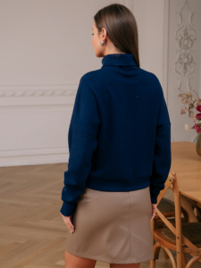 Юбка прямого силуэта с имитацией запаха. Выполнена из эластичной эко-кожи, которая незначительно растягивается и за счет этого идеально садится по фигуре. Верх юбки на поясе, посадка четко по талии. На спинке застежка-молния. Длина изделия 47 см. 90% полиэстер, 10% эластан