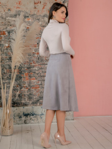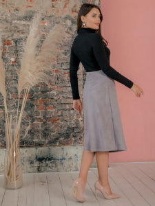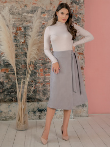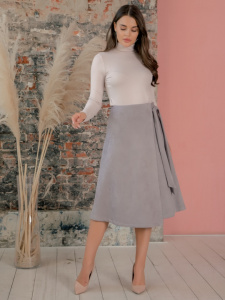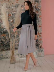 Расклешенная юбка А-силуэта с запахом. Выполнена из эко-замши. Верх юбки на поясе, высокая посадка. Застежка на завязки. Длина изделия 71 см. 90% полиэстер, 10% эластан