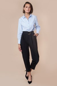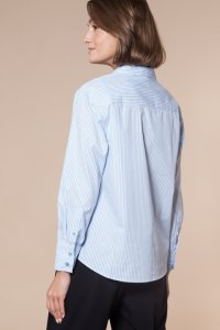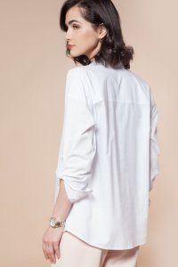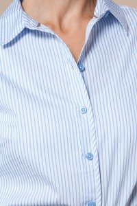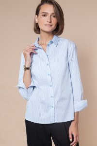 Элегантная блузка классической формы прямого силуэта. Выполнена из ткани с фактурной полосой, из хлопка высокого качества с добавлением полиэстера. Добавление ПЭ помогает сохранить формоустойчивость, меньшую сминаемость и отличный вид ткани даже после множества стирок. Изюминкой, на первый взгляд базовой блузки - является центральная планка, которая украшена кантом из основной ткани, с полосками по косой.