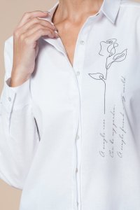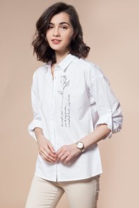 Блузка свободного силуэта из плотной хлопковой ткани и пуговицами из натурального перламутра. Спущенная пройма и возможность крепления рукава на пату. Лаконичный принт роза, начертанная одним штрихом и надпись от руки. Отличный вариант стиля smart-casual, который удобен в любой ситуации, Блузка сочетается с любыми низами, строгий офисный стиль или расслабленный образ с джинсами.
