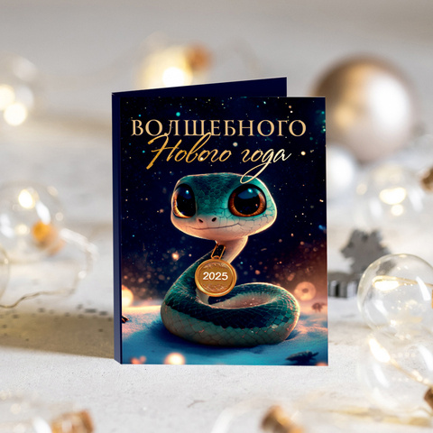 ★︎ Мини-открытка "Волшебного Нового года! (змея на тёмном фоне с монетой 2025)"