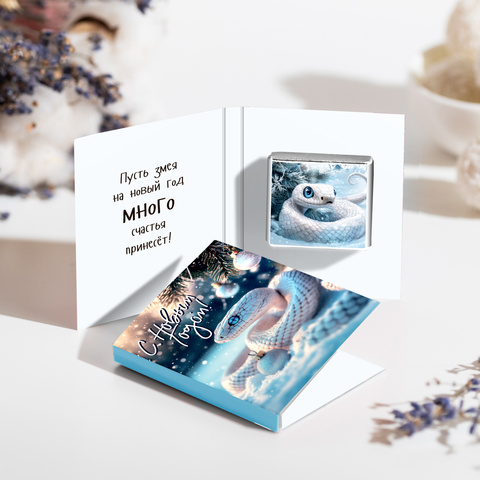 ★︎ Мини-открытка "С Новым годом! (белая змея на мерцающем фоне)"