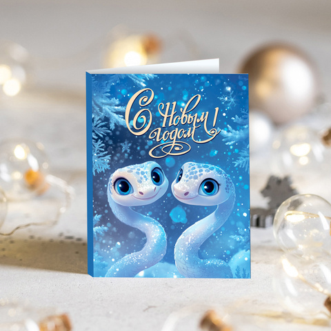 ★︎ Мини-открытка "С Новым годом! (две змеи на голубом фоне)"