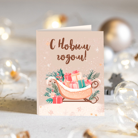 Мини-открытка "С Новым годом! (сани на бежевом фоне)"