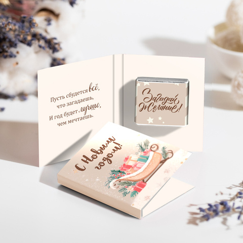 Шоколадка упакована в индивидуальную этикетку с пожеланием.