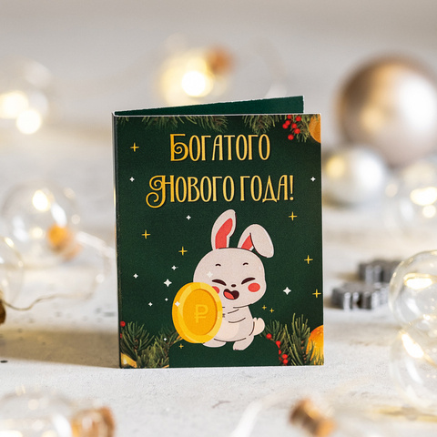 ● Мини-открытка "Богатого Нового года! (зелёная с зайцем)"