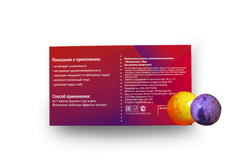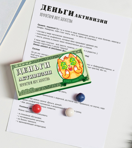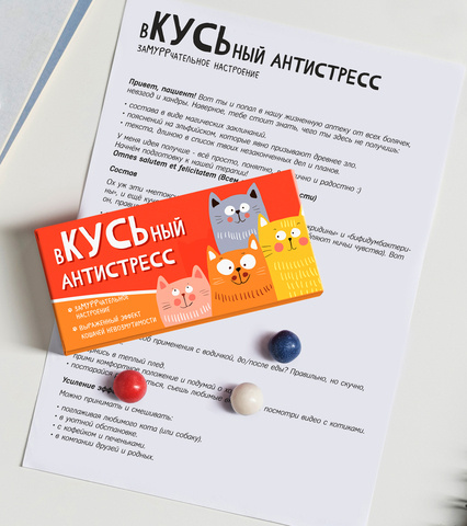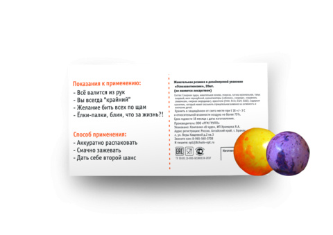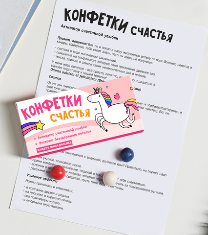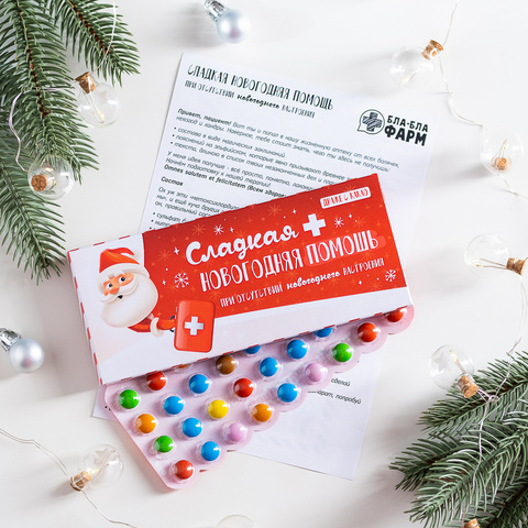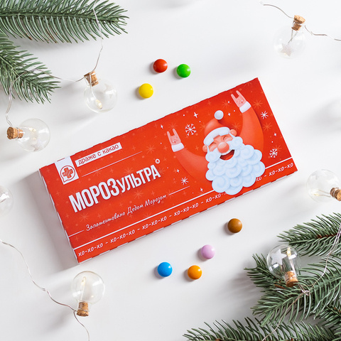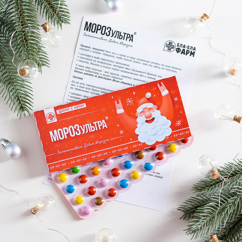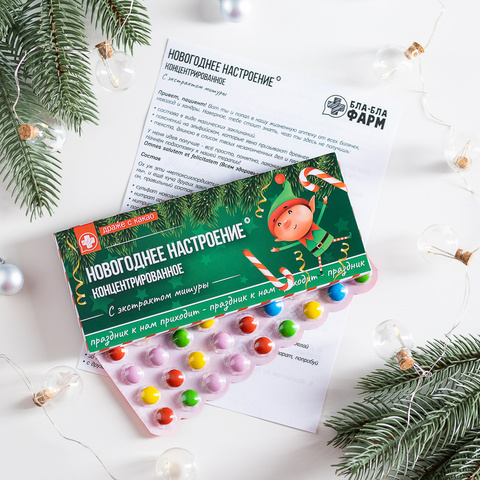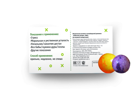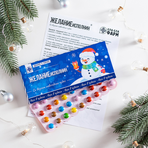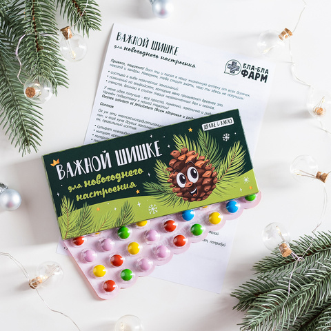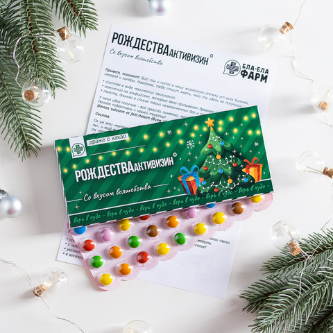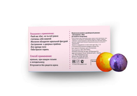 Внутри: 36 разноцветных какао-драже в блистерной упаковке с юмористической инструкцией по применению.