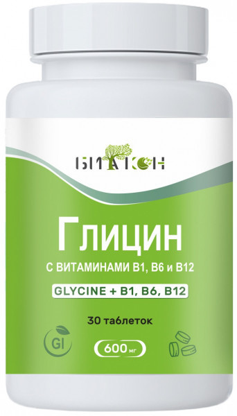 Глицин с витаминами группы В\r<br/>Артикул: BG370500Активное вещество: Глицин, витамины В1, В6, В12Действие: Улучшает состояние нервной системы и головного мозга, укрепляет иммунитет, активизирует расщепление жиров.В упаковке: 30 таблеток\r<br/>Глицин - препарат на основе известной аминокислоты, которая принимает активное участие в расщеплении и транспортировке жиров и гликогенов, что улучшает психоэмоциональное состояние и умственные способности, работу ЖКТ, укрепляет иммунитет, замедляет процессы старения, повышает эластичность кожи, укрепляет кости, связки, хрящи\r<br/>Свойства:- улучшает состояние нервной системы (повышает проводимость нервных импульсов), что позитивно сказывается на психо-эмоциональном состоянии человека;\r<br/>- поддерживает "энергетическое снабжение" головного мозга, что повышает умственные способности;\r<br/>- способствуя расщеплению жиров, Глицин улучшает работу желудочно-кишечного тракта;\r<br/>- активизирует образование коллагена, что улучшает состояние кожи, связок и хрящей (коллаген на 30% состоит из глицина);\r<br/>- способствует синтезу иммуноглобулинов, что позитивно сказывается на повышении эффективности иммунной системы;\r<br/>- препарат усилен витаминами группы В, что улучшает усвоение глицина, повышает его биодоступность, ускоряет процессы метаболизма...Форма выпуска:\r<br/>таблетки массой 600 мг.