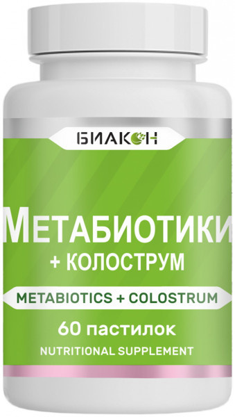 Метабиотики - пептидный комплекс ультрализатов для поддержки микробиоты\r<br/>Активное вещество: Метабиотики, Колострум\r<br/>Действие: Сохраняет нормофлору организма, улучшает процессы пищеварения, устраняет проблемы с ЖКТ, укрепляет иммунитетВ упаковке: 60 пастилок\r<br/>Метабиотики + колострум – это уникальный и полезный комплекс на основе коровьего молозива и ультрализатов пробиотиков, который предназначен для поддержки иммунной системы.\r<br/>В своем составе он содержит иммунные и биоактивные компоненты, необходимые для защиты организма человека, а также для активизации иммунного ответа вирусам и бактериям. Метабиотики также создают благоприятные условия для развития собственной микрофлоры кишечника, в которой присутствуют исключительно полезные микроэлементы, оказывающие позитивное влияние на многие функции.\r<br/>Состав:Содержание в 1 пастилке:\r<br/>\r<br/>1. «Метафул» (Комбуча концентрат, биомасса гидролизованная «УЛЬТРАЛИЗАТ ПЕПТИДНЫЙ» - 200 мг.\r<br/>BB-Bf Bifidobacterium bifidum (ARTB-187),\r<br/>BB-Ad Bifidobacterium adolescentis (ARTB-127),\r<br/>BB-An Bifidobacterium animalis (ARTB-128),\r<br/>BB-Ln Bifidobacterium longum (ARTB-184),\r<br/>BB-Br Bifidobacterium breve (ARTB-129),\r<br/>BB-If Bifidobacterium infantis (ARTB-189),\r<br/>LB-Ac Lactobacillus acidophilus (ARTB-130),\r<br/>LB-Ac Lactobacillus acidophilus (ARTB-177),\r<br/>LB-Pl Lactobacillus plantarum (ARTB-135),\r<br/>LB-Pl Lactobacillus plantarum (ARTB-175),\r<br/>LB-Bg Lactobacillus delbrueckii subsp.bulgaricus (ARTB-131),\r<br/>LB-Sl Lactobacillus salivarius (ARTB-136),\r<br/>LB-Sl Lactobacillus salivarius (ARTB-142),\r<br/>LB-Rm Lactobacillus rhamnosus (ARTB-183),\r<br/>LB-Rm Lactobacillus rhamnosus (ARTB-180),\r<br/>LB-Hl Lactobacillus helveticus (ARTB-133),\r<br/>LB-Hl Lactobacillus helveticus (ARTB-174)\r<br/>\r<br/>2. Колострум (молозиво коровье) - 30 мг. Полезные свойстваОсновные полезные свойства колострума с метабиотиками напрямую связаны с наличием огромного количества полезных микроэлементов в составе данного препарата, в частности, лизатов пробиотиков, иммуноглобулинов, интерферонов, интерлейкинов, лактоферрина, нуклеотидов, эндорфинов, лизоцимов, более 18 видов аминокислот, а также цинка, железа, селена, магния, меди, фосфора и т.д.\r<br/>\r<br/>Метабиотики - это метабиотический консорциум фильтратов, пребиотиков и лизатов паспортизированных пробиотических штаммов микроорганизмов. Пробиотические микроорганизмы выращены инновационным способом совместного культивирования («искусственный кишечник») на специализированной среде с добавлением галакто и глюкоманнанов. Основное его действие направлено на улучшение усваивания питательных веществ, которые поступают в организм. Кроме этого, он также способствует восстановлению здоровой микрофлоры кишечника и нормализации его основных функций, в том числе и защитной.\r<br/>Особенность препарата заключается в том, что он снижает риски появлении злокачественных новообразований в кишечнике. Таким образом активные компоненты, входящие в состав, способствуют защите и предупреждению организма о предстоящей угрозе.\r<br/>\r<br/>Стоит также выделить, что метабиотик способствует улучшению секреции пищеварительных желез. Он обеспечивает попадание в организм полезных веществ, а также необходимых витаминов, которые нужны для нормальной работы многих систем.\r<br/>Отдельно характеризуют противовоспалительное, а также противобактериальное свойство препарата. Он создает специальную защиту на поверхности кишечника, которая способствует предотвращению проникновения вирусов, микробов и других вредных микроорганизмов в кровь.\r<br/>\r<br/>Колострум укрепляет иммунную систему, помогает обеспечить здо