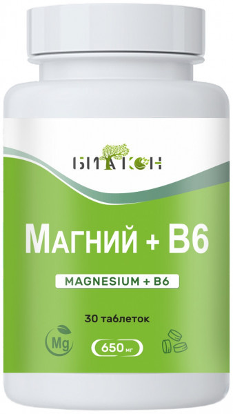 Сочетание магния и витамина В6 для высокой эффективности\r<br/>Артикул: BM503910Активное вещество: Магний, витамин В6Действие: Поддержка нервной и сердечно-сосудистой систем, повышение устойчивости к высоким психологическим нагрузкам - стрессам, депрессии, улучшение сна и купирование мышечных судорогВ упаковке: 30 таблеток\r<br/>Магний + В6 осуществляет поддержку костной, мышечной, нервной, эндокринной и иммунной систем. Продукт обеспечивает стабильное состояние клеточных стенок, хорошую проводимость нервных сигналов, скорость иммунного ответа инфекционным агентам.\r<br/>Свойства- принимает участие в более чем 300 ферментативных реакциях, для выработки белковых соединений, сохранении энергии, нейтрализации множества токсинов, усвоению витаминов группы В и аскорбиновой кислоты;\r<br/>- улучшает тонус сосудов;\r<br/>- ускоряет передачу нервных импульсов;\r<br/>- обеспечивает нормальных рост костной ткани;\r<br/>- нормализует концентрацию сахара в крови;\r<br/>- позитивно воздействует на функциональность сердечной мышцы;\r<br/>- повышает тонус мышц;\r<br/>- снимает раздражительность и нормализует эмоциональный фон;\r<br/>- помогает при бессоннице;\r<br/>- проявляет антиоксидантные свойства (обеспечивает сохранность клеточных оболочек).Форма выпуска:\r<br/>30 таблеток массой по 650 мг.НЕ ЯВЛЯЕТСЯ ЛЕКАРСТВЕННЫМ ПРЕПАРАТОМ