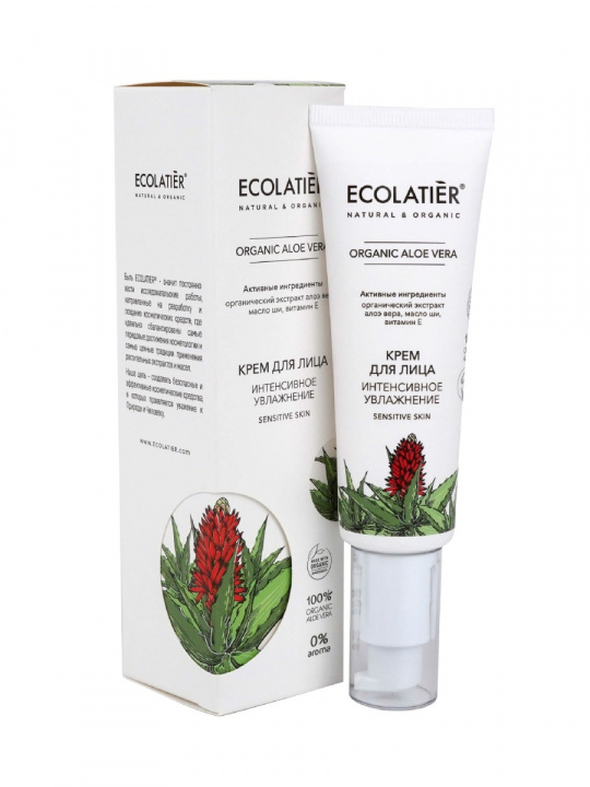 Крем для лица ECOLATIER Organic Aloe Vera интенсивно насыщает влагой сухую обезвоженную кожу, восстанавливает гидро-липидный баланс, дарит комфорт на весь день.Соответствует требованиям Vegan Society (Великобритания). Продукт содержит более 98% ингредиентов растительного происхождения.Органические ингредиенты: Сок органического алоэ вера содержит витамины, аминокислоты, минералы, полисахариды, фитонциды, обладает высокой био доступностью и является природным стимулятором регенерации клеток и тканей, обеспечивает глубокое увлажнение, успокаивает кожу.Масло ши питает кожу, активно омолаживает, повышает ее эластичность, эффективно восстанавливает коллагеновые связи в коже, делая её более упругой и молодой.Витамин Е питает и защищает клетки кожи, предотвращает разрушение коллагена и замедляет естественное старение. Массажными движениями нанесите крем на очищенную кожу лица, избегая области вокруг глаз. Подходит для ежедневного использования. Для наружного применения.