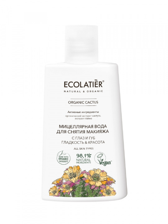 Мицеллярная вода ECOLATIER Organic Cactusделикатно удаляет макияж и загрязнения, нераздражая нежную кожу лица. Дарит ощущениечистоты, позволяет коже "дышать". Благодарявходящим в состав натуральным ингредиентам,увлажняет кожу, подготавливает к дальнейшему уходу.Соответствует требованиям Vegan Society(Великобритания). Продукт содержит более 98%ингредиентов растительного происхождения.Органические ингредиенты: Органический экстракткактуса содержит антиоксиданты, флавоноиды,каротин и витамин С, восстанавливает естественныйбаланс кожи, интенсивно увлажняет ее, улучшаетэластичность.Активные ингредиенты: Экстракт австралийскоголайма содержит АНА кислоты и обеспечиваетделикатное отшелушивание клеток, выравнивает тонлица, делая кожу более гладкой и сияющей. Нанесите мицеллярную водуна ватный диск, протрите лицо, глаза и губы. Прижелании смойте водой. Для наружного применения.