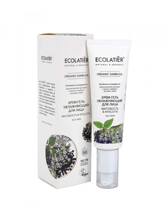 Крем-гель для лица ECOLATIER® Organic Sambuca обладает легкой текстурой и матирующим эффектом, интенсивно увлажняет кожу, восстанавливает гидро-липидный баланс. Обеспечивает комфорт на весь день, может использоваться под макияж. Соответствует требованиям Vegan Society (Великобритания). Продукт содержит более 98% ингредиентов растительного происхождения. Органические ингредиенты: Органический экстракт самбуки содержит уникальные фитокомпоненты, которые эффективно успокаивают кожу, устраняют отечность. Самбука является природным антиоксидантом, насыщает клетки кислородом и защищает от воздействия свободных радикалов. Активные ингредиенты: Масло самбуки содержит натуральные бактерицидные компоненты для ухода за проблемной кожей, питает, улучшает барьерные функции кожи и внешний вид. Экстракт айвы способствует сужению пор, обладает матирующим эффектом, разглаживает кожу, восстанавливает ее эластичность.