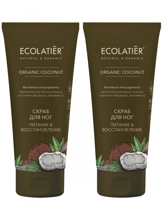 Набор скрабов для ног ECOLATIER Organic Coconut, позволяет совместить эффективное и бережное очищение кожи ног и интенсивный уход. Скрабирующие частицы удаляют ороговевший слой кожи, обеспечивают подготовку ног перед педикюром, мягко полируют, удаляют мозоли, делают стопы мягкими. Ценные масла в составе скраба проникают глубоко в клетки кожи, обеспечивая питание, восстановление и уход. Скраб оставляет на коже приятный запах и ощущение чистоты и свежести.Соответствует требованиям Vegan Society (Великобритания). Продукт содержит более 99% ингредиентов растительного происхождения.Органические ингредиенты: Органическое масло кокоса богато насыщенными жирными кислотами, витаминами группы В и минералами. Усиливает барьерную функцию кожи, препятствует обезвоживанию. Эффективно увлажняет и смягчает.Косточки абрикоса деликатно обновляют кожу, отшелушивают грубый ороговевший слой. Нанесите скраб на влажную кожу, интенсивно помассируйте, смойте водой.