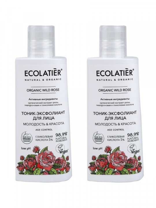 Тоник для лица ECOLAТIER Organic Wild Rose,благодаря гликолевой кислоте, удаляет старые клеткикожи, увлажняет, подготавливает кожу к дальнейшемууходу. Соответствует требованиям Vegan Society(Великобритания). Продукт содержит более 98%ингредиентов растительного происхождения.Органические ингредиенты: Органический экстрактрозы содержит более трехсот активных ингредиентов,что делает его незаменимым компонентомантивозрастных средств. Стимулирует естественныепроцессы обновления, эффективно разглаживает, восстанавливаеткожу, придает ей здоровый и свежий вид.Активные ингредиенты: Гиалуроновая кислотаудерживает влагу в слоях эпидермиса, стимулируетработу фибробластов, тонизирует зрелую кожу,препятствует появлению морщин. Гликолевая кислотаприменяется в уходе за возрастной кожей, запускаетпроцессы обновления клеток и выработки коллагена,выравнивает рельеф кожи и облегчает впитываниеполезных веществ.