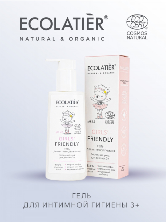 Сохранение женского здоровья юной леди является важнейшей заботой каждой мамы. Обычные моющие средства могут нарушить хрупкую микрофлору деликатной зоны.\r<br/>Интимный гель ECOLATIER&reg; GIRLS&#039; Friendly учитывает особенности полового развития и создано специально для девочек с 3-х лет для экстра бережного ухода.&nbsp;&nbsp;Входящие в состав натуральные компоненты мягко очищают и поддерживают здоровую микрофлору интимной зоны.\r<br/>Гель для интимной гигиены ECOLATIER&reg; GIRLS&#039; Friendly 3+ является гипоаллергенным. Сок алоэ вера обеспечивает необходимое увлажнение и питание кожи интимных зон, предотвращает появление дискомфорта, связанного с сухостью кожи.\r<br/>Экстракт шалфея оказывает противовоспалительное, бактерицидное действие. Натуральный пребиотик поддерживает и оздоравливает естественную микрофлору интимной зоны.\r<br/>Содержит более 97% ингредиентов растительного происхождения.\r<br/>Натуральность ингредиентов и продукта подтверждена сертификатом Ecocert Cosmos Natural и соответствует стандартам Ecocert Standart.