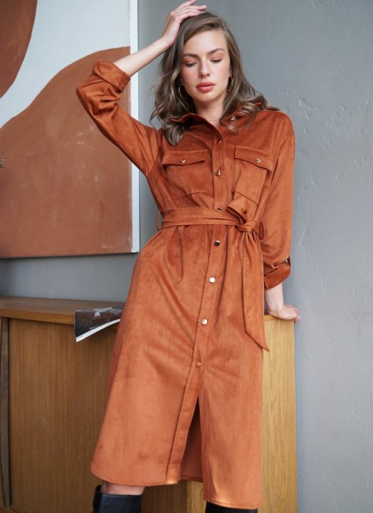Платье-рубашка из тонкой эко-замши, в точности напоминающей натуральную замшу мягкой выделки. Высокотехнологичная проработка верхнего слоя позволяет добиться 100% имитации натуральности. При этом платье можно стирать без риска потери качества. Оно удобно в носке и приятно на ощупь.