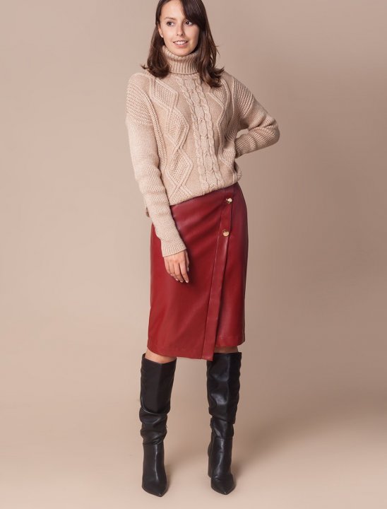 Юбка из эко-кожи с запахом и золотистыми пуговицами.