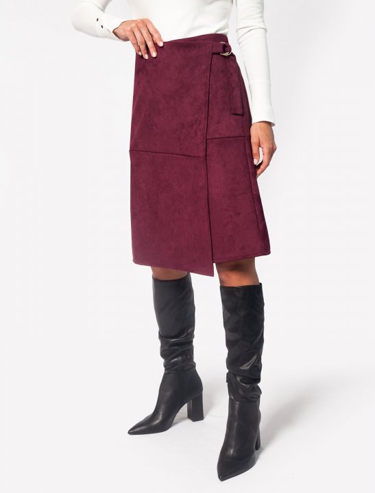 Трендовая юбка на запах. В основе ткани плотное трикотажное полотно Джерси, без подкладки, толщиной в точности напоминающей натуральную замшу мягкой выделки. Высокотехнологичная проработка верхнего слоя позволяет добиться 100% имитации натуральности. При этом юбку можно стирать без риска потери качества. Эластичность материала придает комфорта в носке. Надежно застегивается на пуговицу с внутренней стороны и ркгулируется завязкой. Украшена высококачественной фурнитурой - пряжками золтистого цвета. Данный фасон подходит для любого типа фигуры.