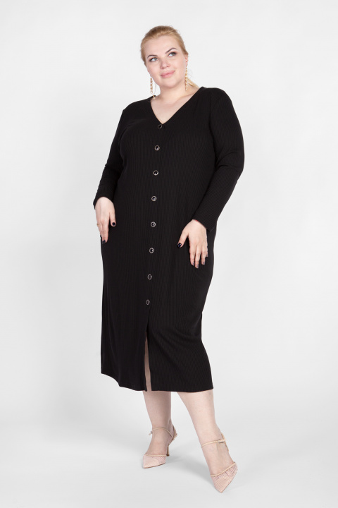 Платье женское полуприлегающего силуэта, длинной ниже икр из трикотажного полотна. Полочка с имитацией застежки по ценру и с пришивными пуговицами, от нижней пуговицы борт распахивается. Рукава длинные втачные. Вырез горловины V- образной формы. Актуальное платье для любого мероприятия, прекрасно впишется в гардероб и будет отлично сочетаться с любыми аксессуарами.