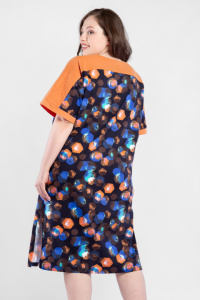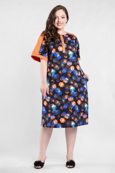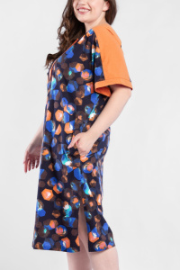 Платье женское, свободного силуэта, удобной длиной ниже колен. Изделие с цельнокроеными рукавами, длиной до линии локтя. Низ рукава с притачными манжетами. Горловина круглая, обработана окантовкой.