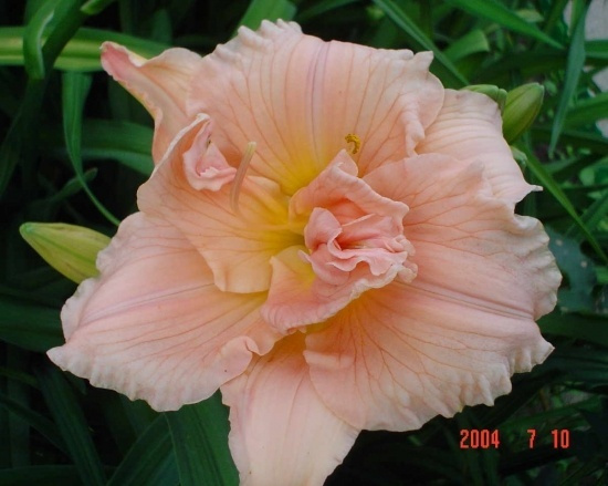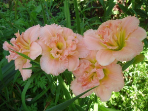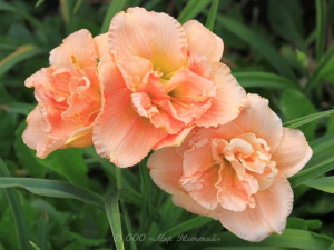 Высота растения 45см, цветок лососево-розовый с зеленым горлом, махровый. Цветение июнь-июль.