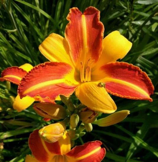 Цветок двухцветный: внутренние лепестки красные с желтой полосой по центру, внешние оранжево-желтые, цветение обильное. Цветение август-сентябрь.