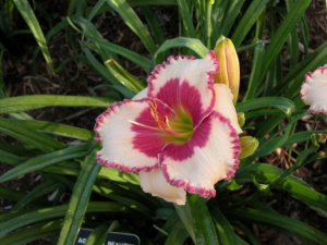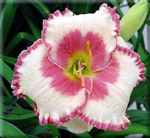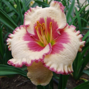 Высота растения 65см, кремово-желтый с красной окантовкой и глазком, горло зеленое, гофрированный, повторное цветение. Цветение июль-август.