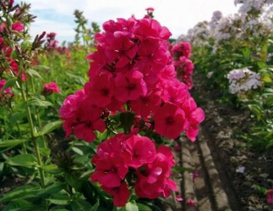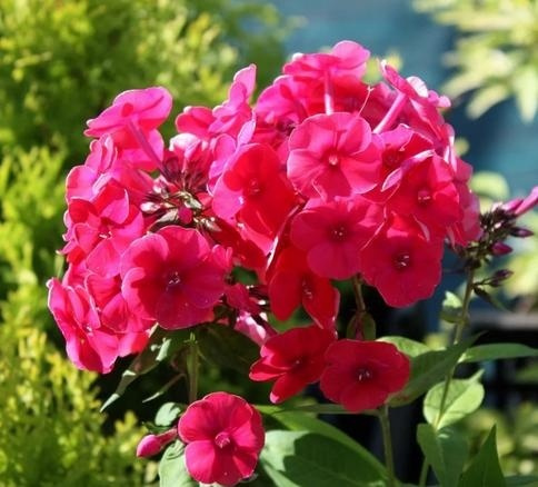 Малиново -красный, яркий. Слегка выгорает на ярком солнце. Соцветие округло-коническое, средней величины и плотности. Куст сильный, раскидистый, стебли прочные. Разрастается очень быстро.