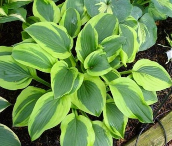Хоста с очень крупными темно сине-зелеными, округлыми, гофрированными листьями.