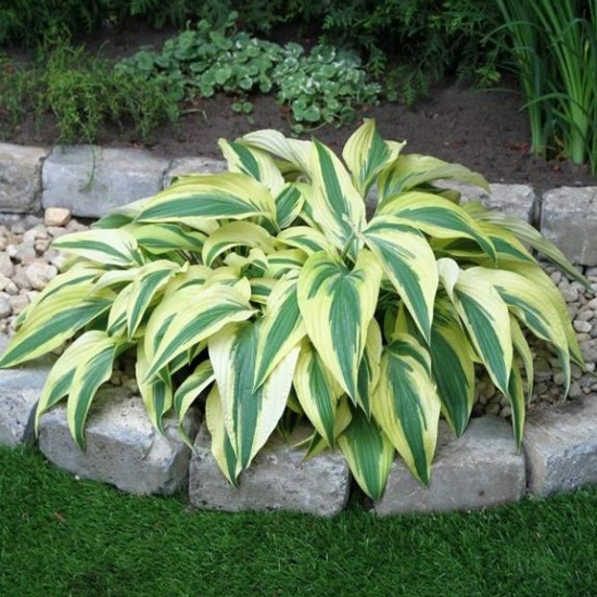 Высота куста 45см, ширина 75см, листья сине-зеленые с широкой белой каймой, цветки бледно-лавандовые. Очень эффектная.