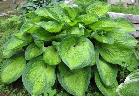 Сердцевидные, морщинистые листья, ярко желто-зеленые в центре и сине-зеленые по краям.