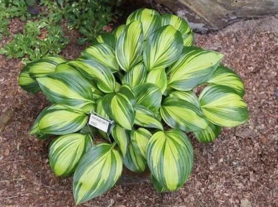 Высота куста 30см, ширина 30см, листья салатного цвета с темно-зелеными полосками.