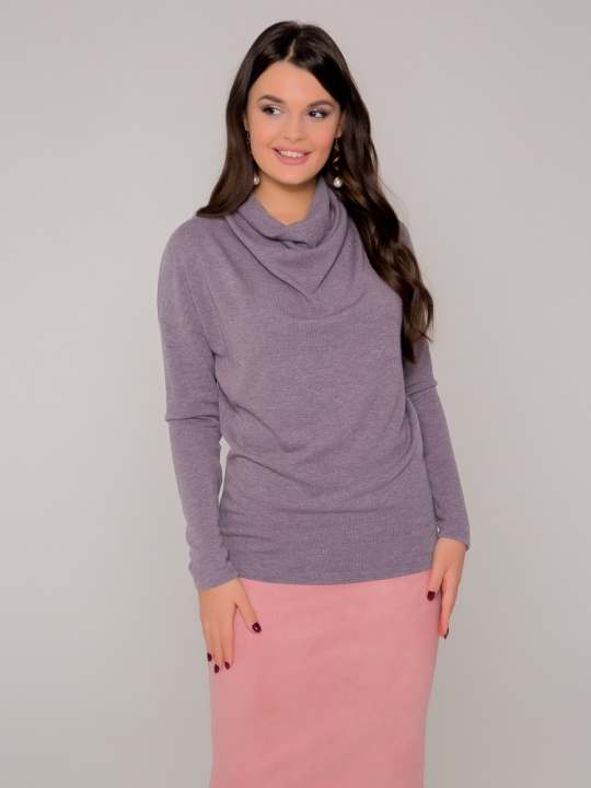 Мягкий теплый джемпер серого цвета из высококачественного вязанного трикотажа с ангорой. Сложный оригинальный крой позволяют трансформировать этот джемпер. Вы можете поднять узкий рукав и создать красивую драпировку на воротнике и лифе. Или же наоборот, опустить рукав вниз, при этом создав мягкую драпировку на запястье. Длина по спинке 62 см. 75% акрил, 20% шерсть, 5% эластан