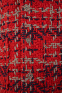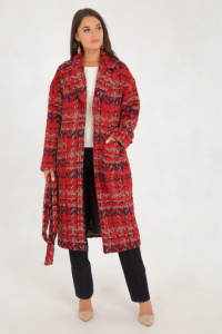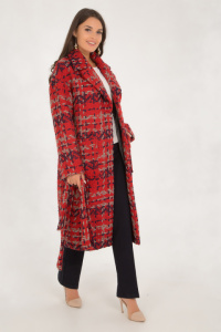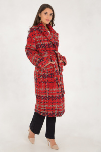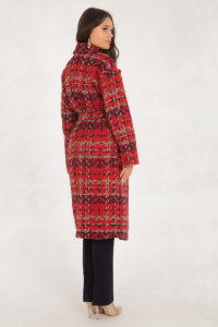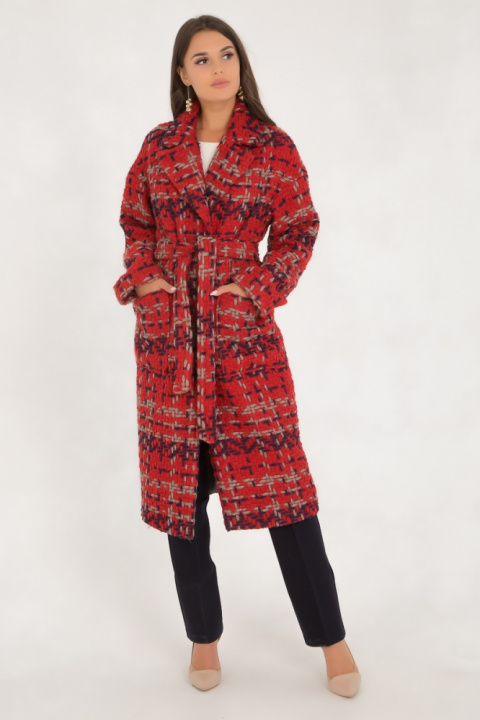 Пальто из объемной фактурной ткани красно-синего цвета, на подкладке. Силуэт прямой, немного зауженный к низу, рукав спущенный. На полочке два накладных кармана, пояс в комплекте. Спереди застежка на пришивные кнопки. Учитывайте покрой "oversize" при выборе размера. Длина по спинке 110 см. 20% вискоза, 80% пэ/100% пэ